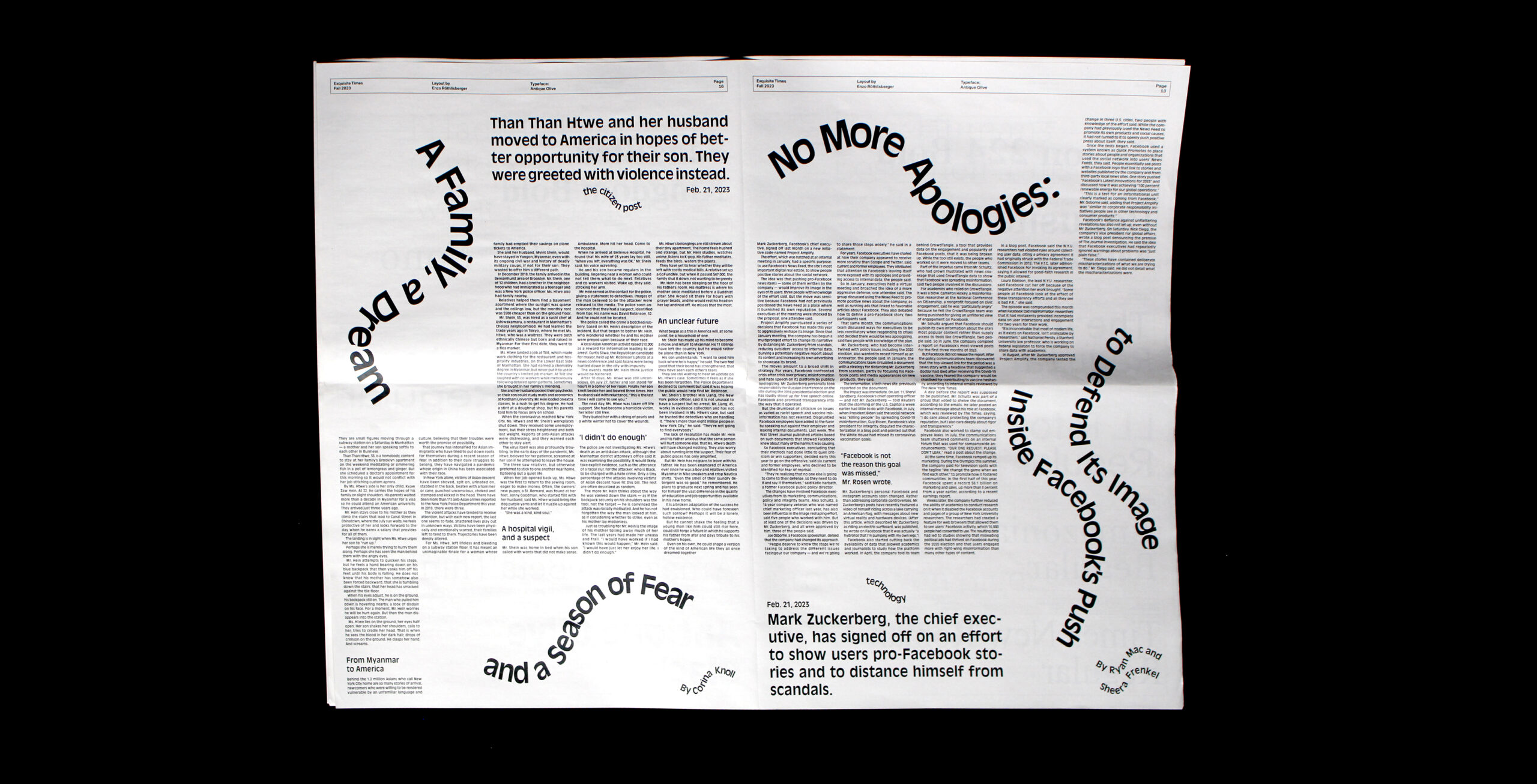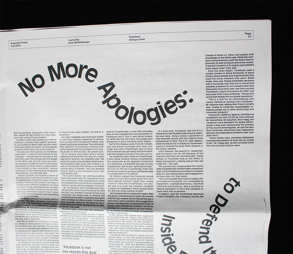 This was one of my first projects during my training, where I chose the typeface Antique Olive, created in 1962 at the Olive foundry in Marseille. I picked it less for its graphic qualities than for the story it carried and my attachment to Marseille and the south of France. Today, I would probably not make the same choice, but at that time my beginner’s naïveté became the project’s strength: I dared to break some rules, like using wave-shaped titles, while also learning the discipline of page layout.